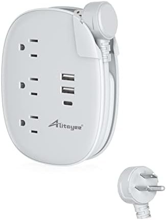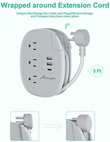 USB Travel Power Strip with Wrapped Extension Cord- 3ft retractable extension cord with 45-degree right angled flat plug, get easy access to place that’s hard to reach. The 3-prong grounded right angle flat plug keeps your other wall outlets free.better for on the desktop or nightstand.