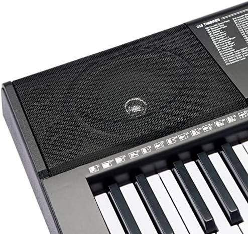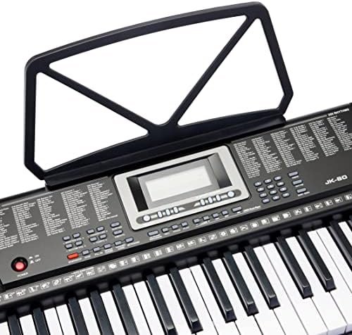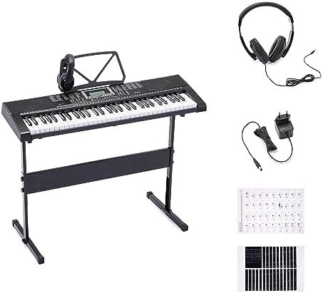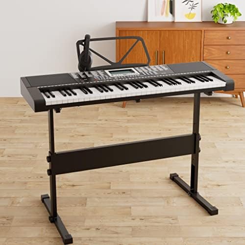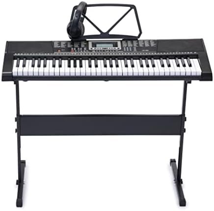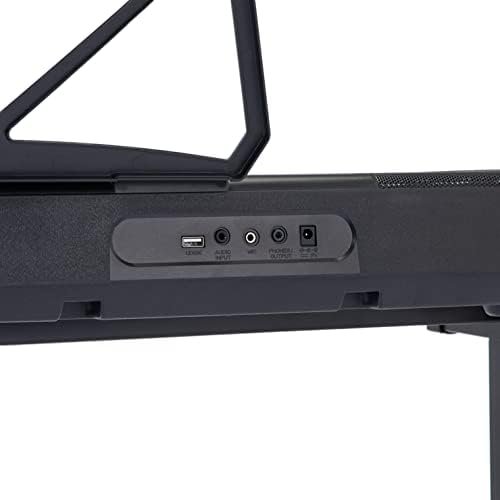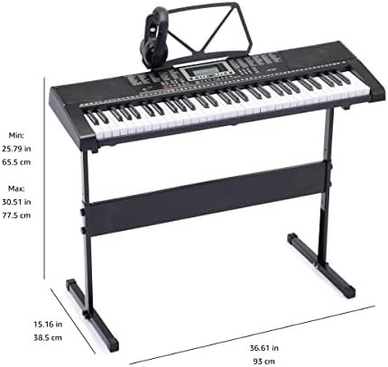 Includes a black electronic keyboard with 61 keys full size standard, built-in speakers, LCD display, and built-in songs
