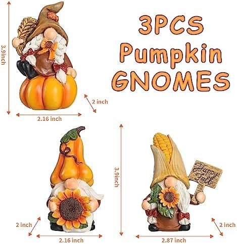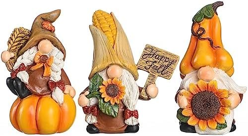 FALL GIFTS: Three adorable dwarfs, the first one sitting on a pumpkin with wheat ears in her hand, one with a corn shaped head and a‘Happy Fall’ sign in his hand, the other with a pumpkin on his head and huge sunflowers in his hands. The designs of pumpkins, wheat ears, and corn sunflowers are full of autumn atmosphere, symbolizing harvest and abundance. Let them bring your best wishes to yourself and your family and friends