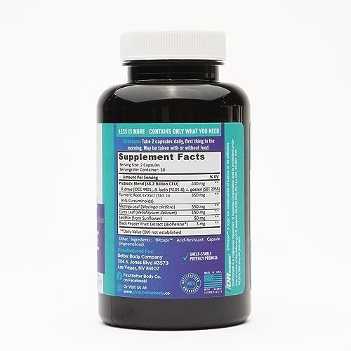 INGREDIENTS: Premium Probiotic blend (L.Gasseri, B.Breve, B.Lactis) 68.2 billion CFUs per serving, Turmeric Curcumin standardized to 95% curcuminoids, 100% organic Moringa Oleifera leaf extract, pure Curry Leaf extract, Bioperine black pepper extract, Sunflower Lecithin Booster, DRCaps