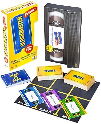 Blockbuster is back with another movie game that’s filled with all the best movies from the last 10 years. This movie party game is for anyone who’s ever seen a movie: Since we’ve only included super-popular movies, you don’t have to be a Hollywood hotshot to win this fun family board game. And the best thing of all – if you loved the first Blockbuster game you’ll be able to play this new version by itself, or combine it with the original version for a mega-game! The Aim of the Game is to be the first team to collect two movie cards from each of the four genres. The genres are “”From Another Planet””, “”Remakes and Reboots””, “”Heart Warmers”” and “”Not For Kids”” First Select the “Head-to-Head” mode on the Big Potato Buzzer App and hand it to two players, one from each team. They sit opposite each other and place the phone between them, with their fingers at the ready. Countdown from three, then flip over a Head-to-Head Card. This will reveal a random category, such as “Movies with boats”. The first player to think of a movie with a boat in it shouts out the name of the movie and presses the buzzer button to start the 15-second countdown. Their opponent must now shout out another movie featuring a boat and hit the timer before the 15 seconds are up. Players keep going back and forth, like a round of movie title ping pong, until someone runs out of time. The winner now takes an advantage into the Triple Charades Round. The player who won the Head-to-Head Round draws six Movie Cards from the deck and secretly looks at them. They give the “”hardest”” three to their opponent from the Head-to-Head Round (who keeps them secret from their team) and take the ‘easiest’ three for themselves. Both players must now decide which cards to place face down on each of their category squares on the board. Now they must try to get their team to guess their movies in one of the following ways in 30 seconds selecting the triple charades mode on the buzzer app. One word: Describe the movie to your team using one carefully chosen word. Feel free to repeat until you’re blue in the face. Quote it: Describe the movie to your team by shouting out a quote. If you don’t know one, make it up. Act it: Channel your inner De Niro and act out the movie to your team. No talking allowed. When the time’s up, they add all the Movie Cards they’ve won to their collection. Now it’s the other team’s turn. The player who lost the Head-to-Head Round tries to describe them to their team in the same way as before. They can also steal any remaining Movie Cards left by their opponents, but they have to get theirs first. The first team to successfully collect two movies from each of the four genres wins the game! Blockbuster a family board game that adults will love. Guaranteed to make your list of Top 10 new board games for 2020, Featuring 100 brand new Movie Cards, 30 head to head cards For 4+ players ages 12 and up.