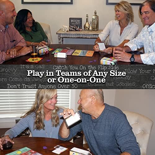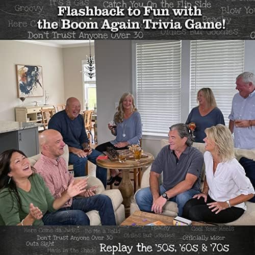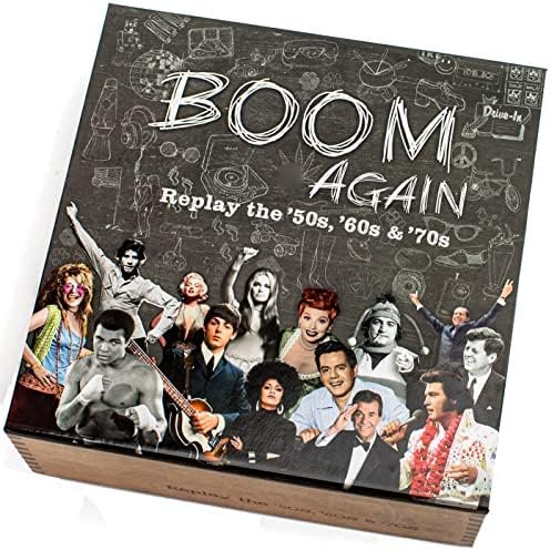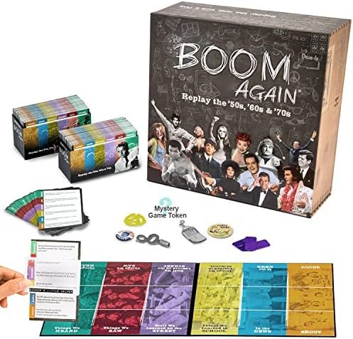 QUICK-START, EASY TO PLAY, JUST MINUTES TO MEMORIES: Three easy steps and you’re playing BOOM AGAIN. Choose your team and category. Answer the question correctly. Move the game token toward your team. Expert at The Beatles or ‘70s music, choose “Things We Heard.” Love Toys from the ‘50s? Choose “Things We Saw.” Crave trivia from the politics and Hippy movements of the ‘60s? Choose “In the News.” BOOM AGAIN will have you laughing in minutes!