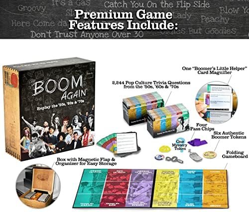 BEST GIFT FOR FRIENDS, PARENTS & GRANDPARENTS: BOOM AGAIN is the only game made for Boomers by Boomers. Perfect for casual get togethers, family holiday gatherings, happy hours, and parties. If you’re in hot pursuit of the best birthday, Christmas, host or hostess gift, BOOM AGAIN is the perfect present. All 2,244 trivia questions and game tokens are Boom era specific, celebrating the Boomer decades and pop culture of the times.