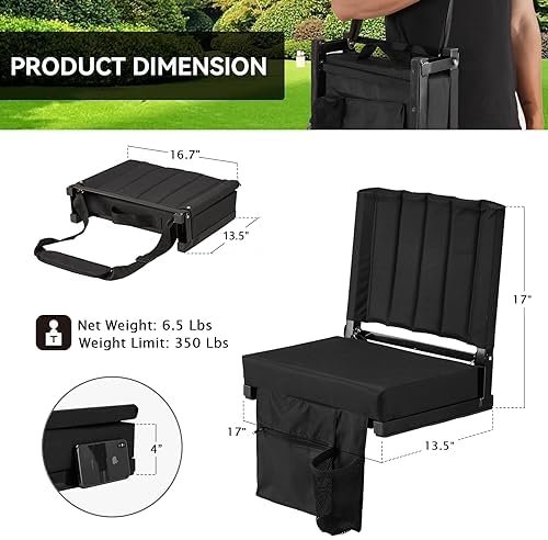 【Multi Usage】:Seat size: 17 inches W x 13.5 inches L x 17 inches H. Weight:7.27Lbs. Maximum support weight : 350Lbs. This stadium seat is ideal for any outdoor events, parks, picnics, camping etc. You can take the seat to wherever you like and it can help you reduce the pain of long time seating on the hard bleachers.