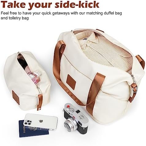 The duffel bag, backpakck and toiletry bag are all made of polyester fabric which is mild water-resistant. The duffel bag and backpack are both designed with the back sleeve, so you can conveniently attach them to the retractable luggage handle. There are multiple functional pockets in the backpack, making it versatile for different needs of travel.