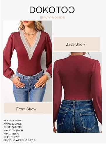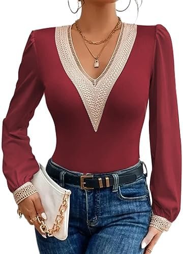 Dokotoo Women’s Lace V Neck Blouses Puff Long Sleeves Pullover Fashion Bodysuit