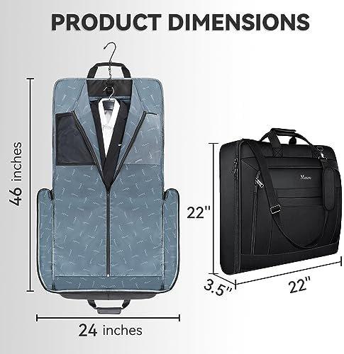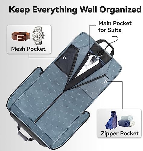 ▶40L Suit Garment Bag: Dimensions 22″L x 22″W x 3.5″H. The extended size of convertible garment bag for hanging clothes is 46 x 24 inches. Detachable and adjustable shoulder strap makes this dress garment travel bag help to loose load of shoulders.Carry on garment bag for travel makes people more focus on their trip. This folding travel garment bag will be a good travelers gift,too