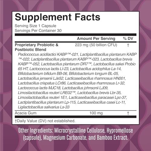 Vegan Formula: Proprietary Probiotic & Postbiotic Blend (50 billion CFU), Acacia Gum, Microcrystalline Cellulose, Hypromellose (capsule), Magnesium Carbonate, and Bamboo Extract