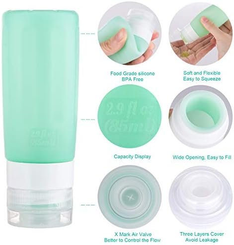 【SILICONE & SQUEEZABLE】Made of food grade Silicone which is BPA free and non-toxic, feel soft, flexible and comfortable instead of hard like traditional plastic travel bottles. The silicone is thick and durable but can be squeezed easily