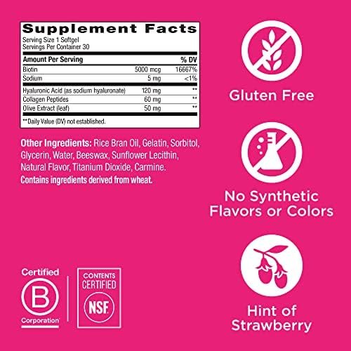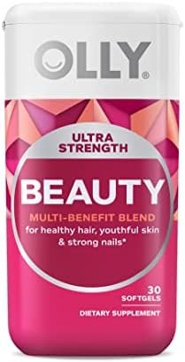 OLLY Ultra Strength Beauty Softgels support healthy hair, radiant skin and strong nails. This multi-benefit blend features Biotin, Hyaluronic Acid, Collagen Peptides and Olive Leaf Extract to help you shine bright from within.* The goods inside: Biotin and Hyaluronic Acid help reduce the appearance of fine lines and wrinkles and support gorgeous hair and nails. Collagen Peptides provide the building blocks for collagen production, and Olive Leaf Extract provides antioxidant support for radiant skin.* For a fresh twist, our premium, easy-to-swallow softgels have a hint of strawberry and zero sugar. Don’t let their size fool you—these little guys go big on results. Toss ‘em in your bag and be on your way. Adults, take 1 softgel with water per day. At OLLY, good health is at the center of everything we do. We make delightful vitamins and supplements with real-deal benefits that help you live Happy Inside Out.* *These statements have not been evaluated by the Food and Drug Administration. This product is not intended to diagnose, treat, cure or prevent any disease. Amazon Form Factor Gel Cap