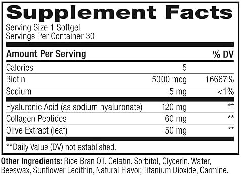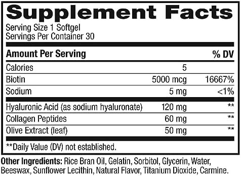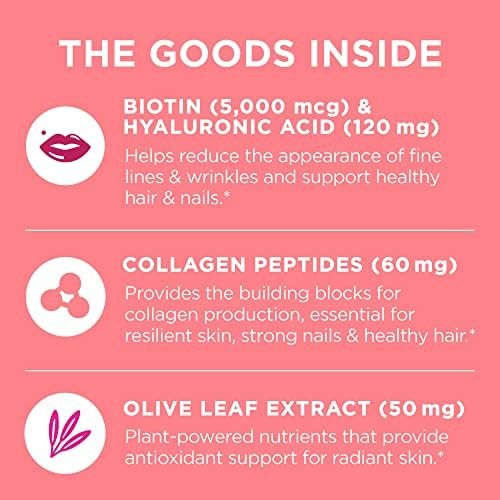 THE GOODS INSIDE: Expert blend with Biotin, Hyaluronic Acid, Collagen Peptides and Olive Leaf Extract.