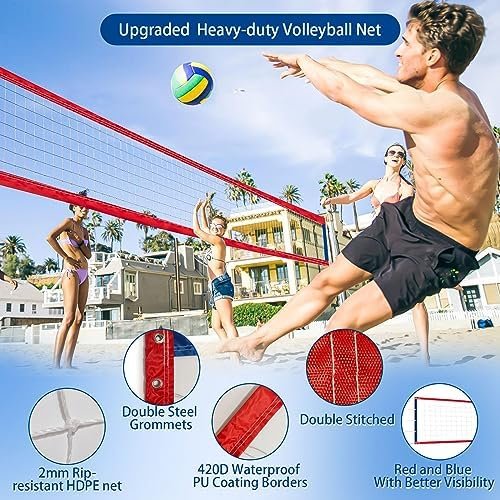 Premium Quality: High-Density polyethylene rip-resistant 2mm knotted volley ball net, thickened 420D heavy-duty nylon with waterproof PU coating borders, reinforced with sturdy stitching, ensuring added strength and stability during intense volleyball matches.