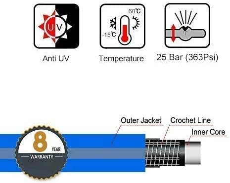 👍 BURST RESISTANCE & ANTI UV – With a burst strength of 363 PSI and heavy duty nylon reinforcement for high pressure areas, this 4 layers tube reinforced with X-shape threads hose was built for heavy duty jobs around your home and garden. Extreme all weather flexibility from +40°C ~ -10°C.