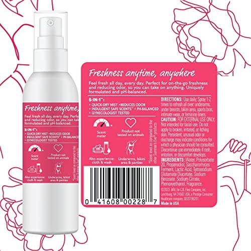 Summer’s Eve Refresher Mist is a body spray for women that has over 300+ sprays and is safe to use daily, all over – under your arms, breasts, and even in intimate areas and on feminine hygiene products