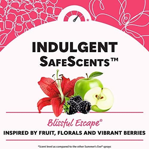 Summer’s Eve Blissful Escape Refresher Mist is a light, refreshing, quick-drying feminine spray that is perfect for on-the-go freshness. The Blissful Escape indulgent SafeScents is inspired by fruit, florals, and vibrant berries. Your new best friend in your feminine care routine, this intimate mist reduces odor, goes on easily and provides an instant boost of freshness. With over 300 sprays per bottle, this body spray for women can be used all over to help reduce odor: underarms, under breasts, bikini area, sports bras, intimate wear, or feminine liners. Ideal for any time you might work up a sweat, the travel-size bottle fits perfectly in your gym bag for workouts, toiletry bag for travel, beach bag for sunny summer days, or purse for date night. Summer’s Eve Refresher Mists are pH balanced, hypoallergenic and safe for daily use. All Summer’s Eve feminine hygiene products are gynecologist tested to ensure they are safe, even for sensitive skin. Feel fresh, on-the-go all day, every day with Summer’s Eve Blissful Escape Refresher Mist.
